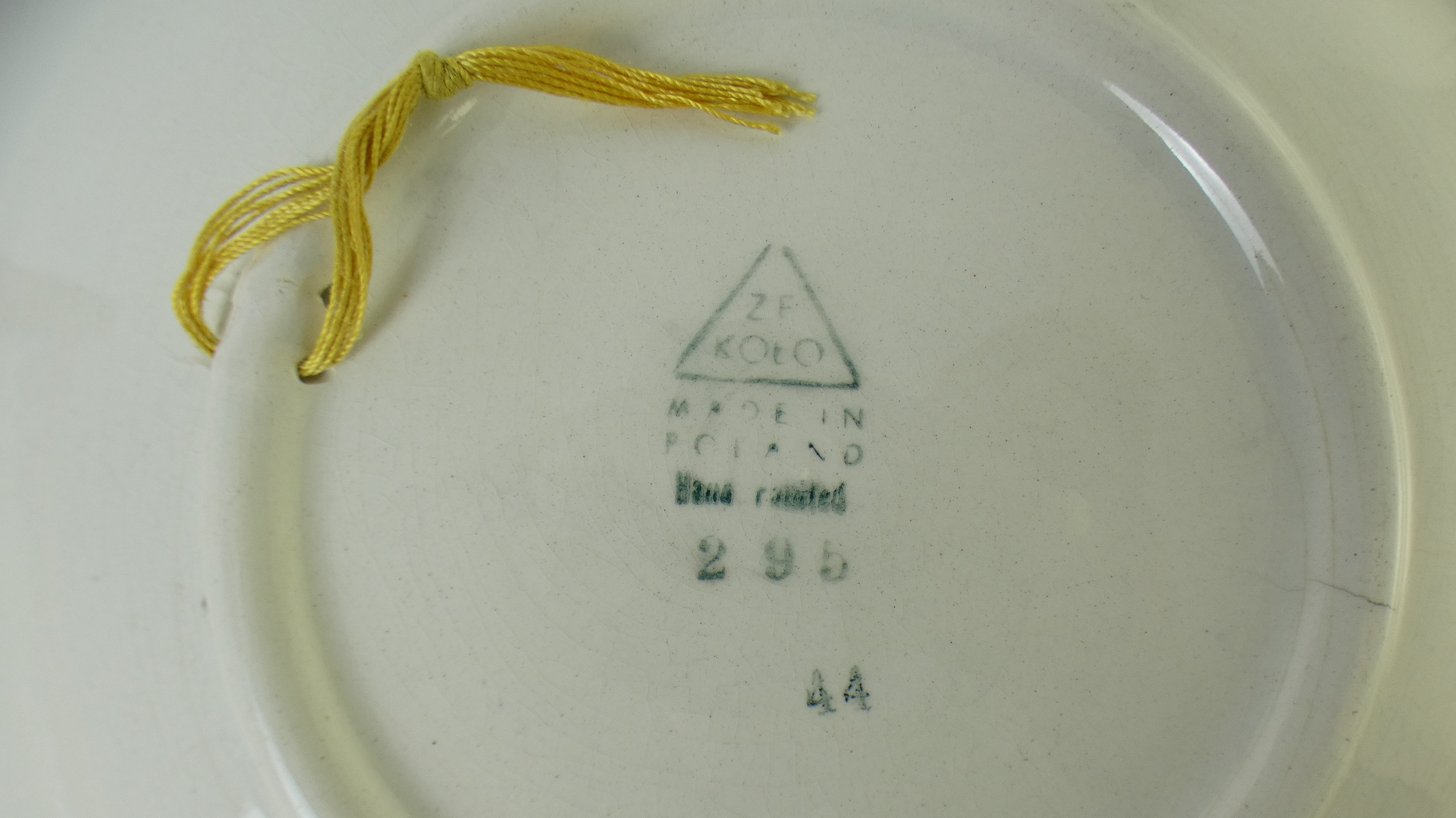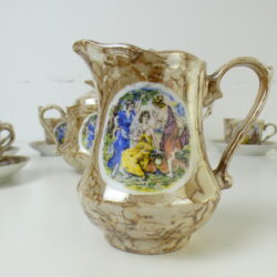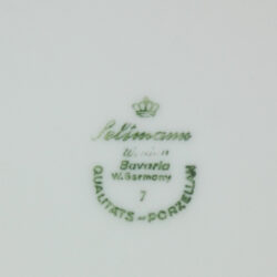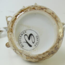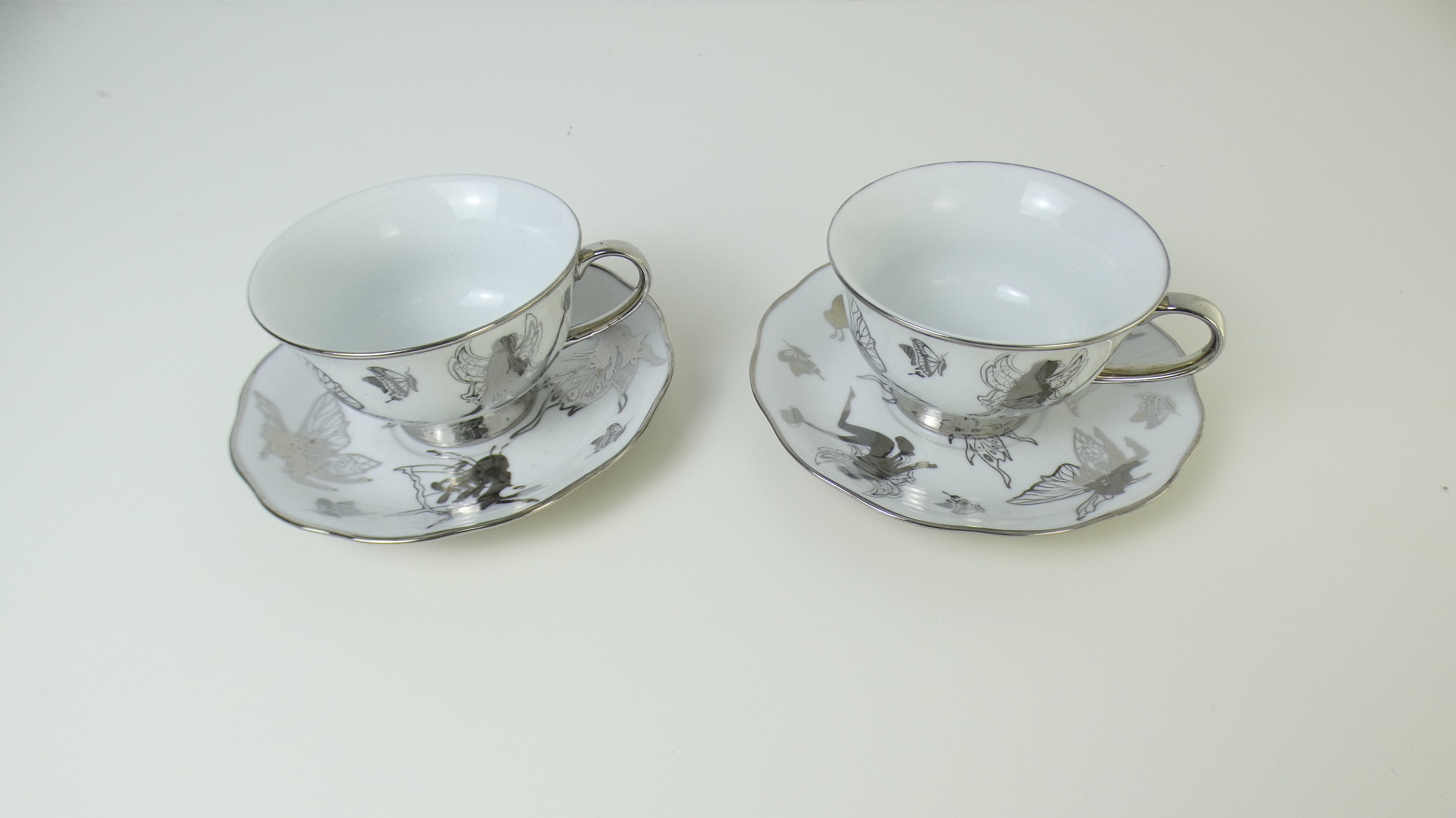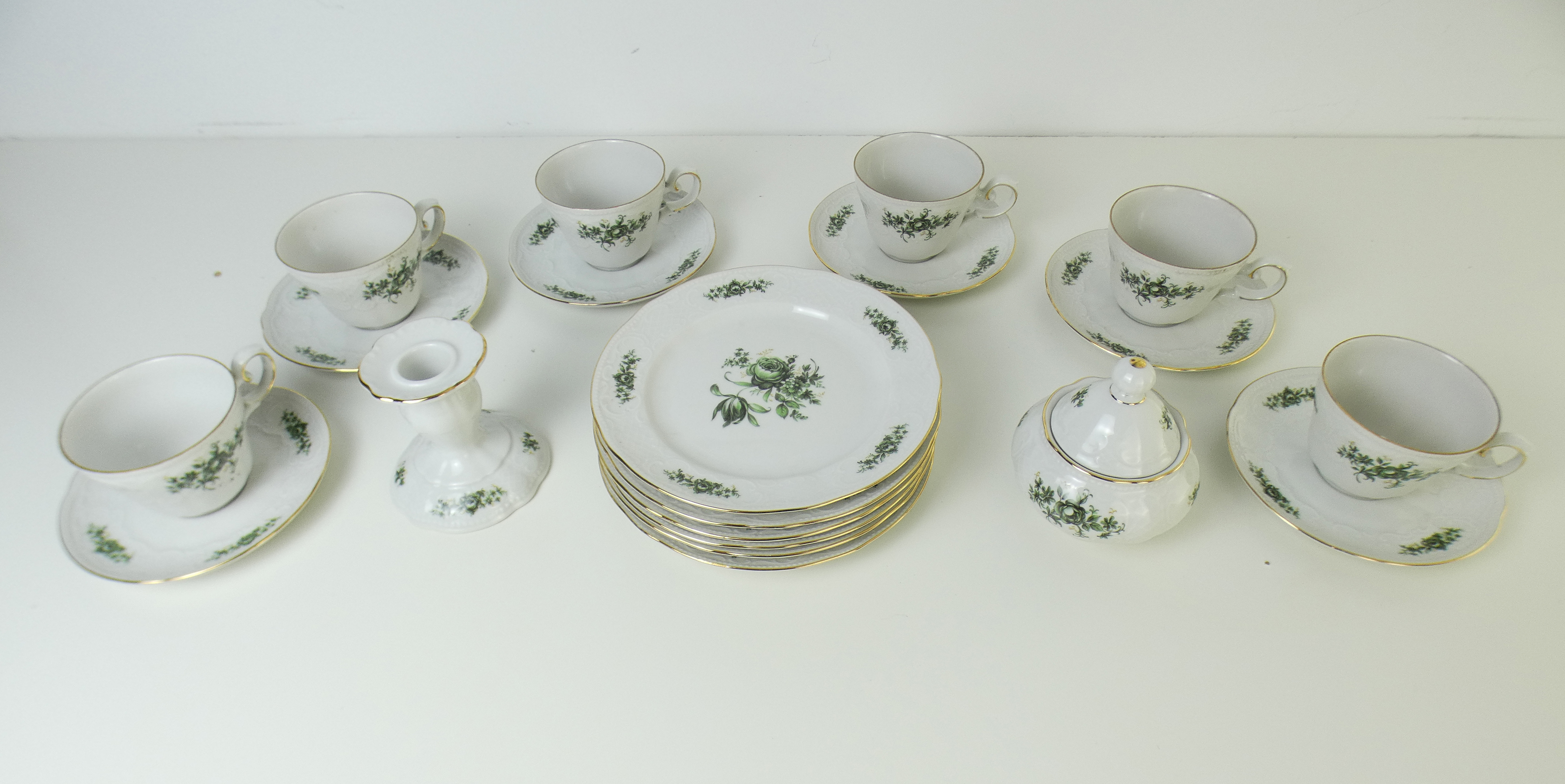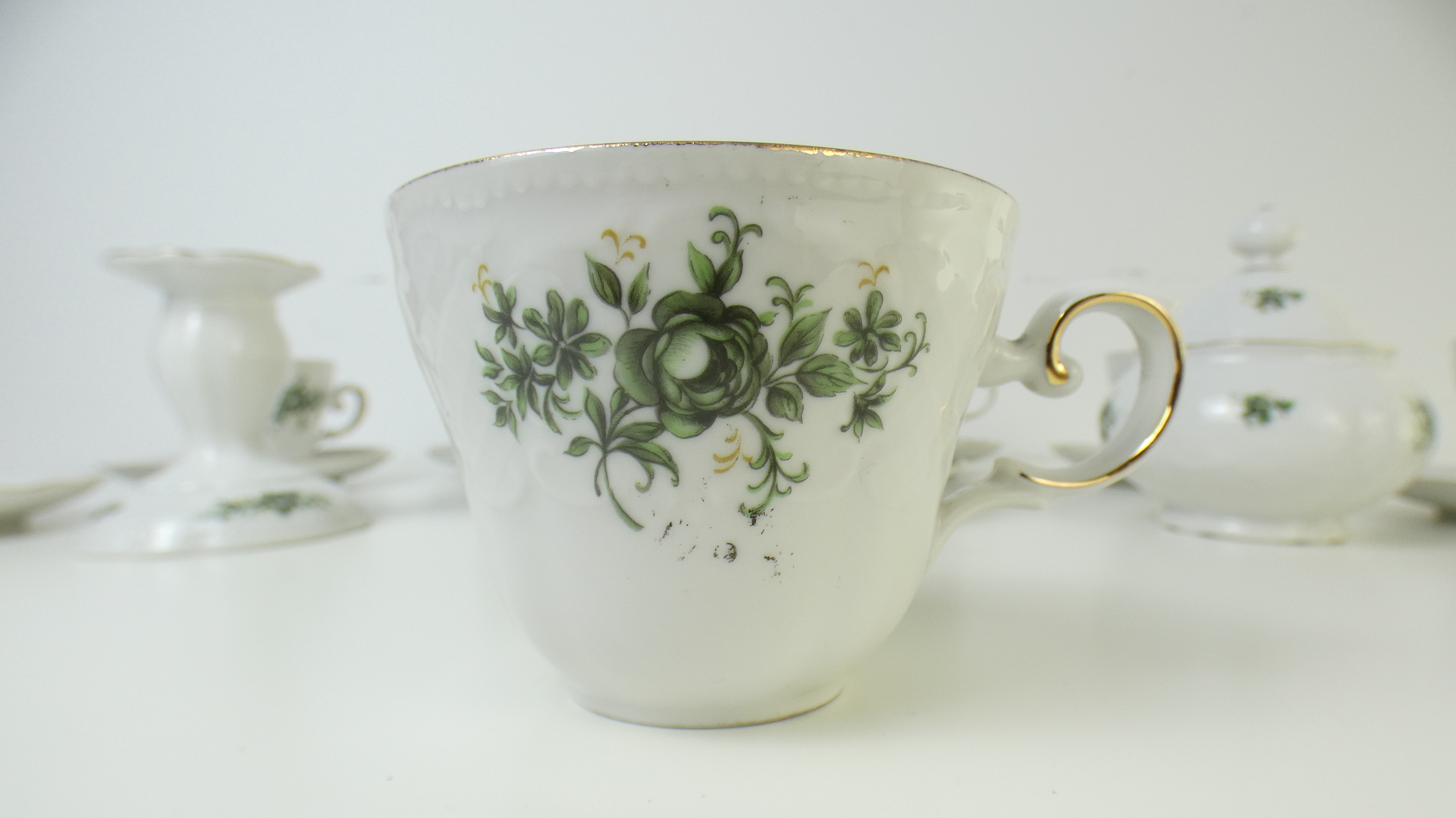 W zestawie brakuje jednego spodka pod filiżankę – reszta kompletu w bardzo dobrym stanie, bez pęknięć i wyszczerbień.
