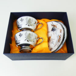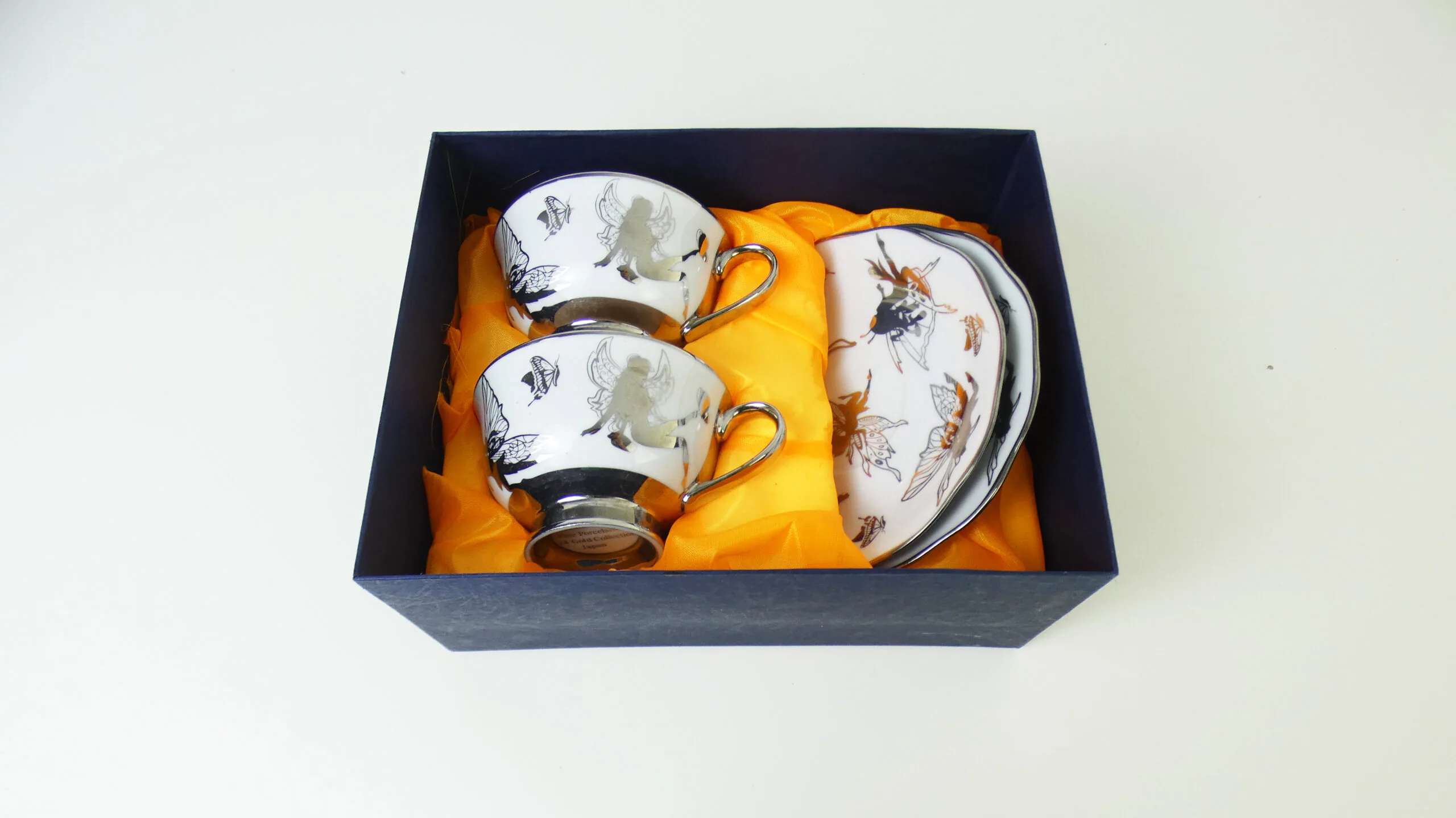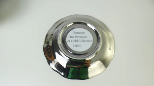 Elegancki zestaw porcelany Yamansen – Fine Porcelain, 24 Gold Collection. Porcelana pochodząca z Japonii, wyróżnia się subtelną formą oraz eleganckim, klasycznym wzornictwem. Zestaw prezentuje się bardzo efektownie i może stanowić zarówno praktyczny komplet do kawy, jak i piękną ozdobę witryny. Stan bardzo dobry. Jedna filiżanka posiada niewielki wyszczerbek (widoczny na zdjęciu). Poza tym elementy bez pęknięć i innych uszkodzeń.