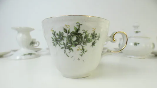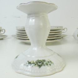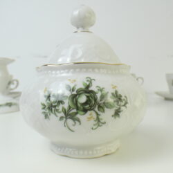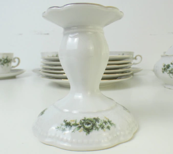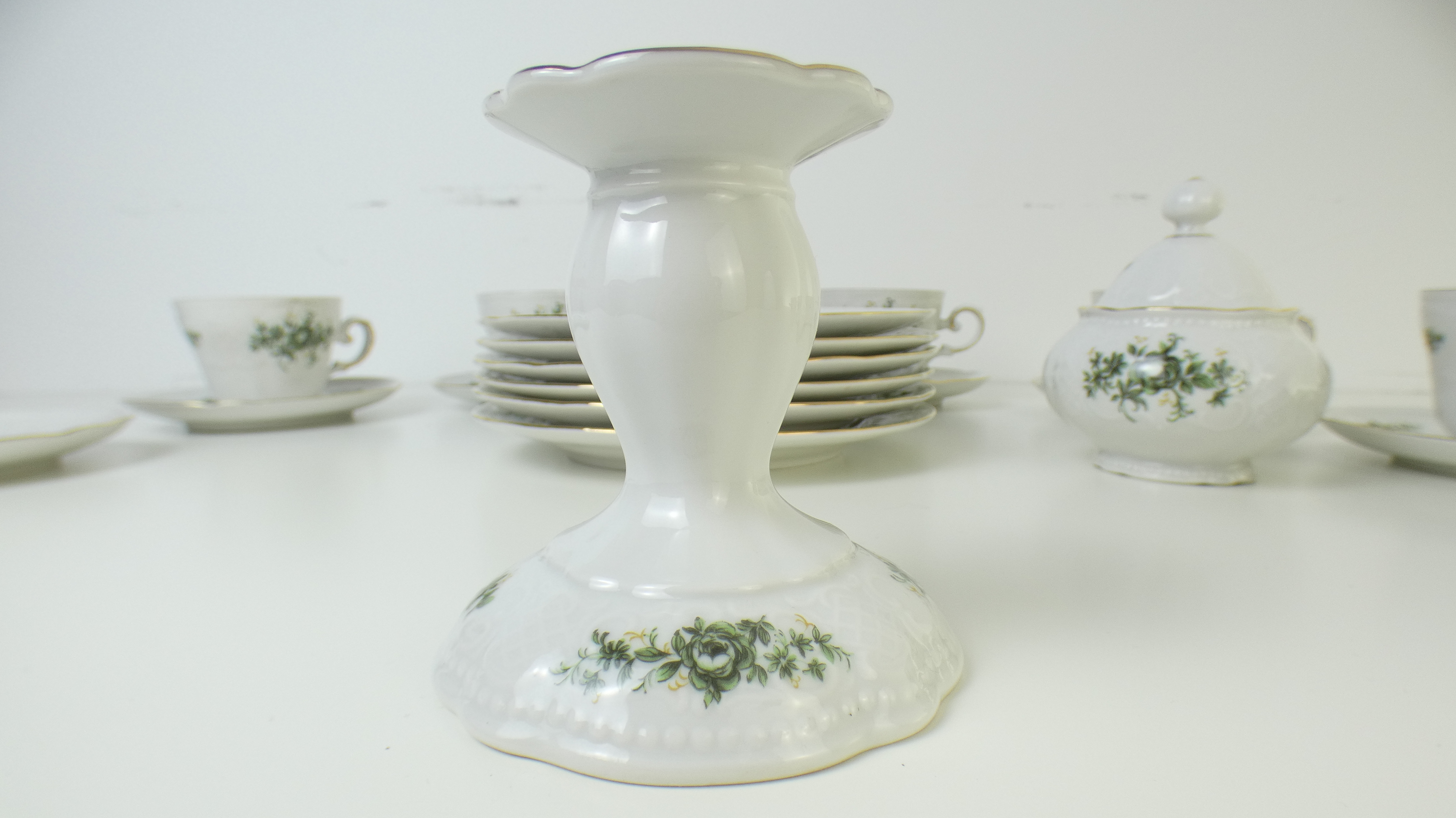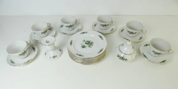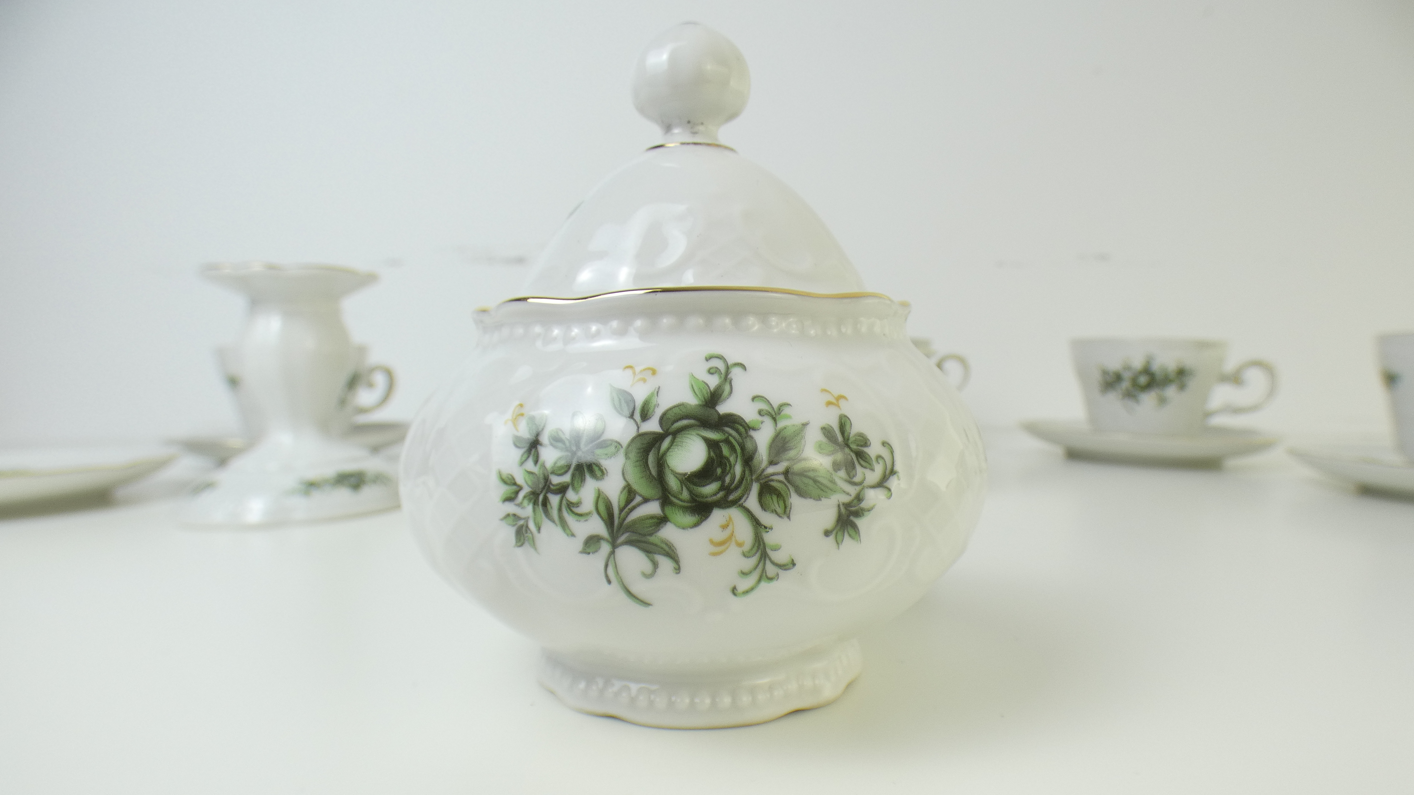 Zestaw kawowy Bavaria Klasyczna, wysokiej jakości porcelana niemiecka. Charakteryzuje się delikatnym zdobieniem i ponadczasową elegancją. Doskonała zarówno do codziennego użytku, jak i na wyjątkowe okazje. Stan bardzo dobry – bez pęknięć i wyszczerbień.