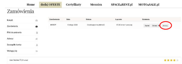 Następnie po zalogowaniu się do serwisu ogłoszeniowego na Nasze konto pokaże się Panel z opcjami i udostępnionymi funkcjami jak poniżej. Mamy do wyboru : edycję zamówienia | edycję danych teleadresowych | szczegóły kont. Po prawej stronie w kolumnie DZIAŁANIA mamy do wyboru : Zapłać | Zobacz | Anuluj. O ile chcemy usunąć opłacone ogłoszenie z serwisu ogłoszeniowego klikam w przycisk – ANULUJ. Należy pamiętać iż usunięcie ogłoszenie jest bezpowrotne. Usunięcie ogłoszenia nie powoduje anulowanie opłaty za publikowane ogłoszenie. Jest to tylko i wyłącznie skróceni czasu emisji co nie ma płwyu na pobraną opłatę za emisję ogłoszenia.